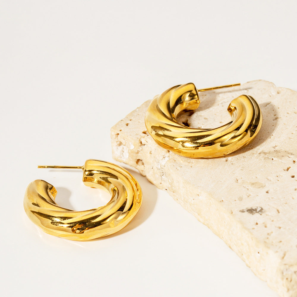 Discover our retro-inspired twisted C-shape stud earrings, crafted from durable stainless steel with a luxurious gold plating. These elegant earrings offer a timeless design with a modern twist, perfect for any occasion. An excellent choice for retailers and fashion brands looking to enhance their collection with high-quality, stylish accessories.