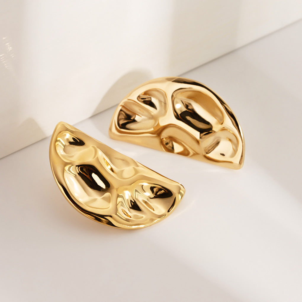 A pair of gold stainless steel half-circle stud earrings showcasing the unique abstract hammered design.