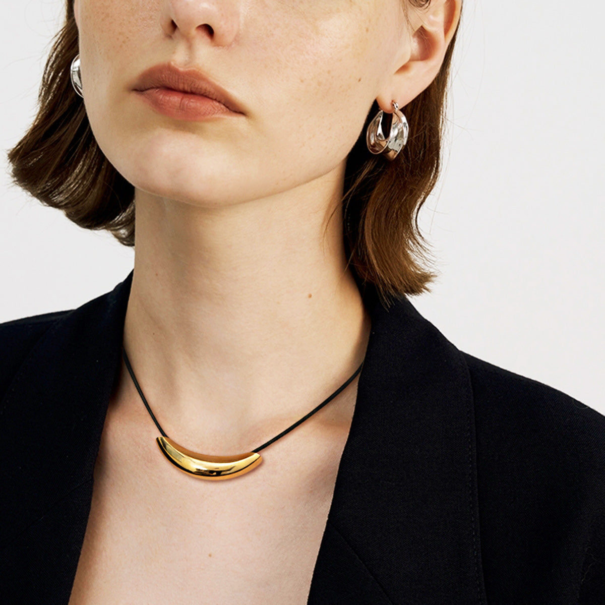 Detail shot of the necklace's black cord and gold clasp, showcasing its construction.
