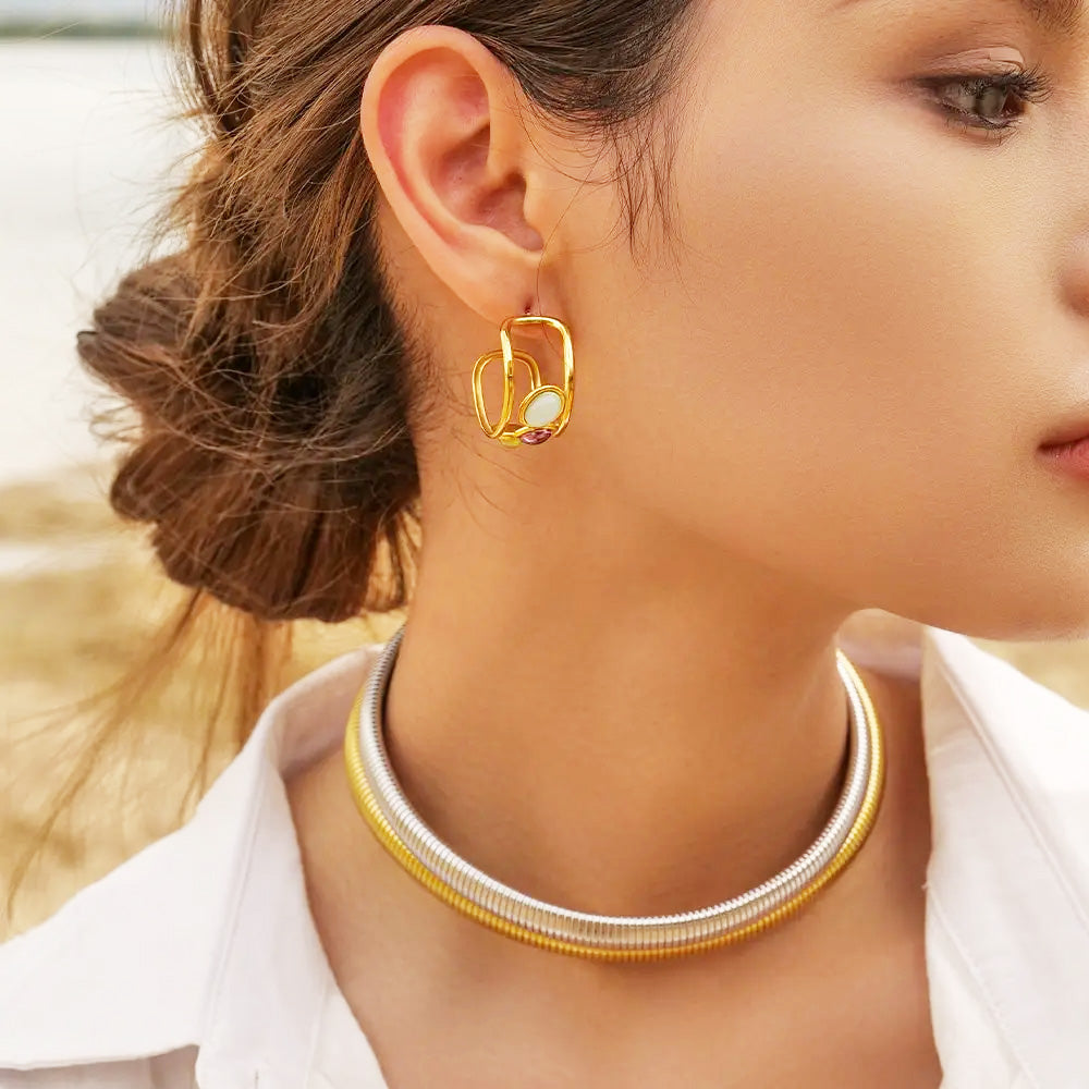 Discover the vibrant charm of our Spanish-style stud earrings, crafted from durable stainless steel for lasting beauty. Each earring features a trio of stunning, colorful opal stones that capture the light with every movement. This exquisite set offers a touch of elegance and a pop of color, making it a versatile accessory for both casual and formal occasions. Perfect for retailers and fashion brands, these earrings combine quality craftsmanship with a timeless design, ensuring they become a cherished addition to any jewelry collection.