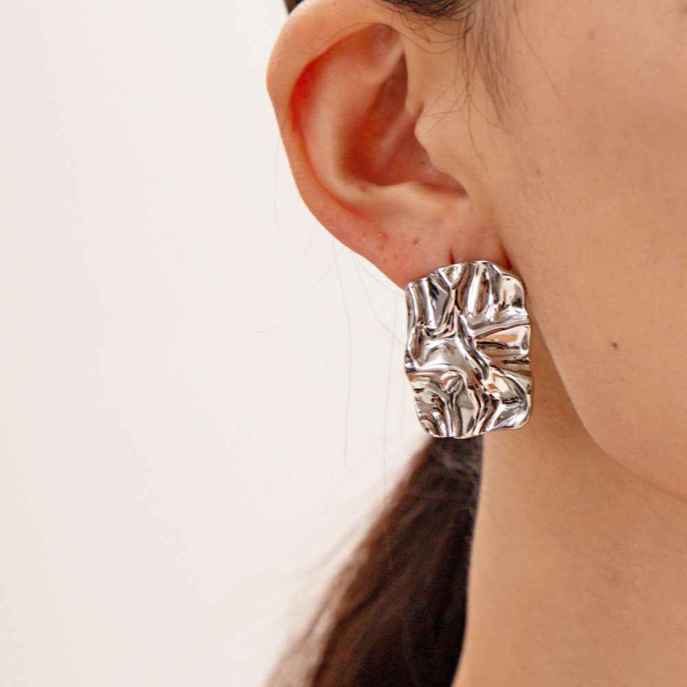 A pair of silver chunky rectangle stud earrings with a unique textured surface.