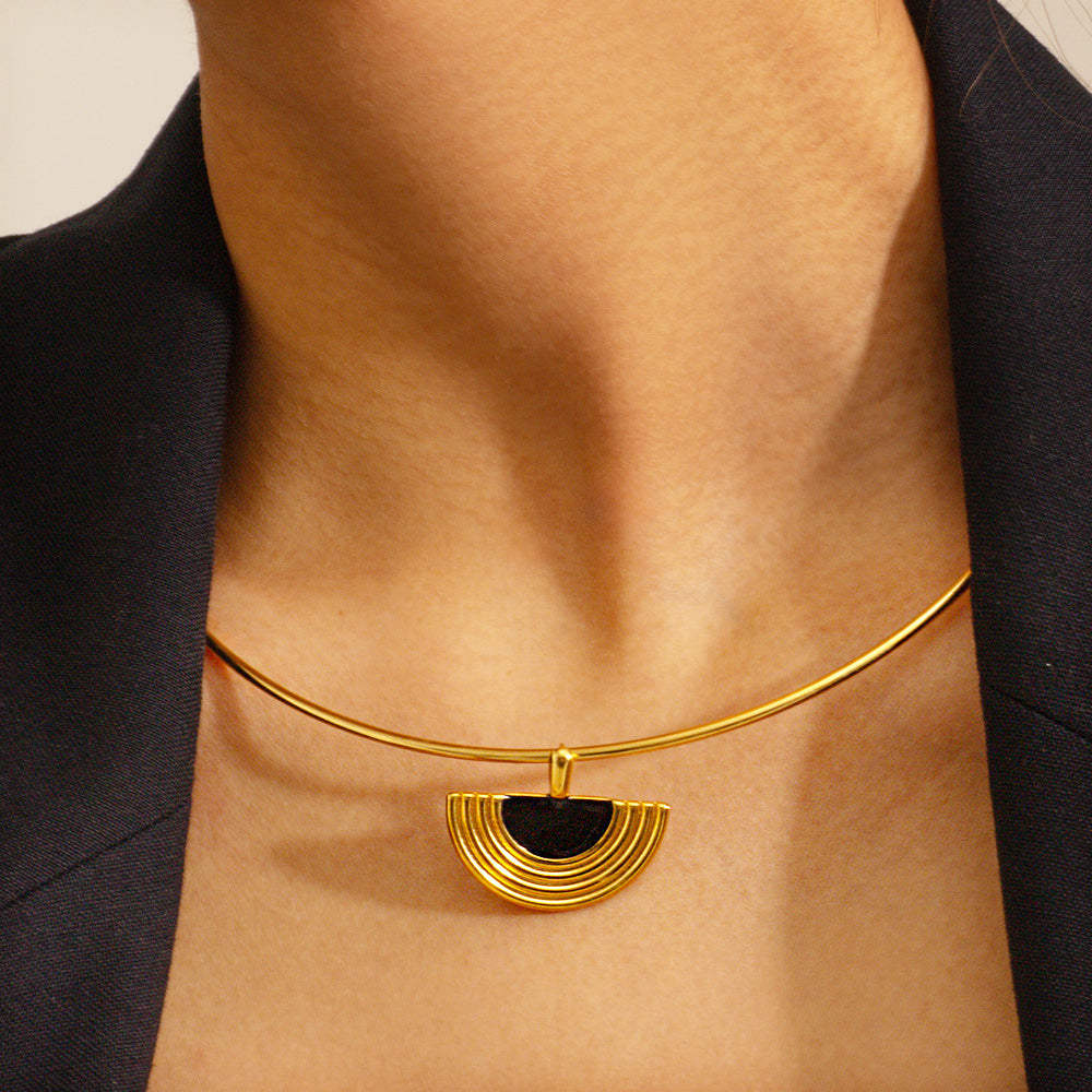 Detailed shot of the gold necklace with its unique half-circle pendant design.