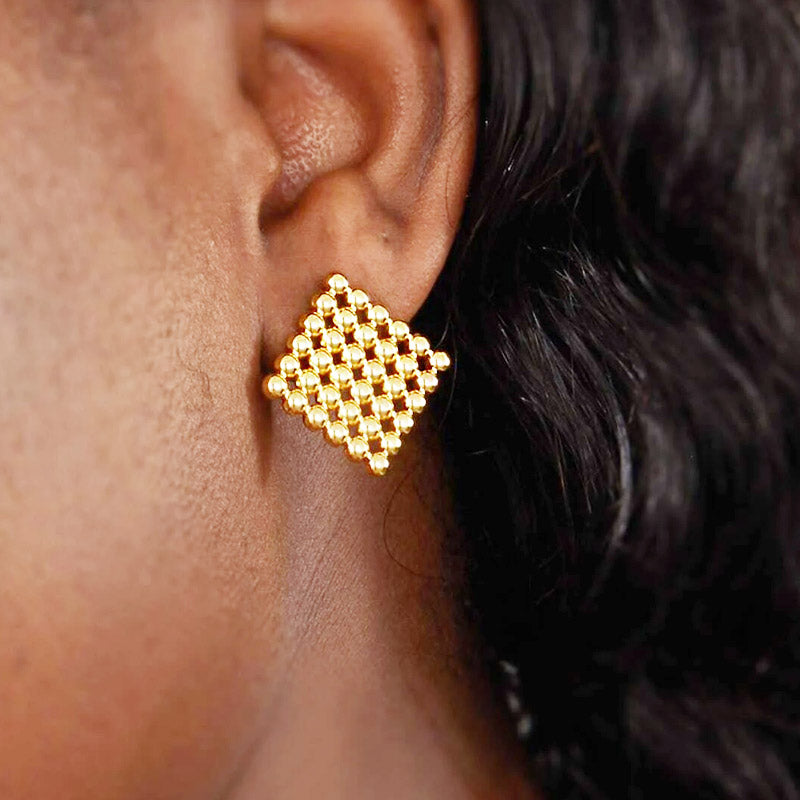 Detailed view of the square stud earrings with a textured grid pattern of small spheres.