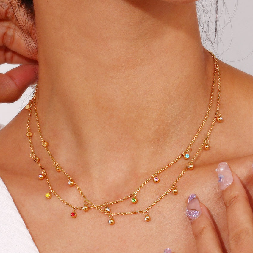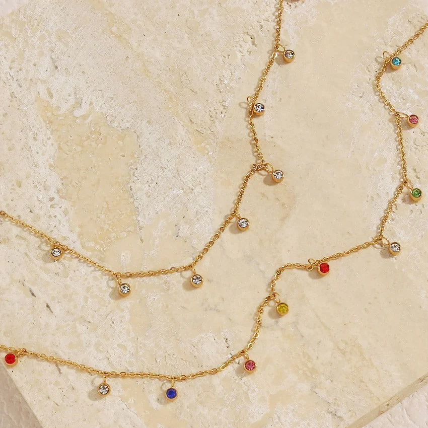 Model wearing the dainty gold necklace with vibrant multicoloured zircon stones.