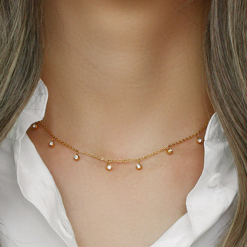 A model showcasing the elegant gold necklace with clear, sparkling zircon stones.