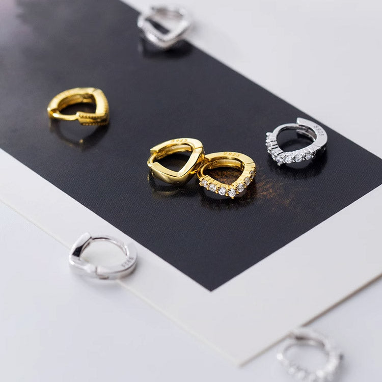 Close-up view of the V-shape huggie earrings in Plain, CZ, and Dot styles.