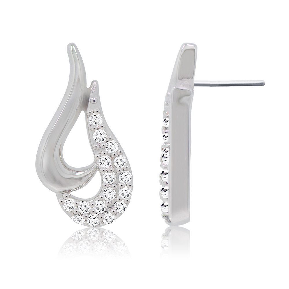 These Swirls Stud Earrings feature an elegant, curved design adorned with brilliant white cubic zirconia. Made from durable brass with a lustrous silver rhodium plating, they are designed for both beauty and longevity. The post closure ensures a secure and comfortable fit. These earrings are sold as a pair and are a perfect example of classic style meeting contemporary craftsmanship.