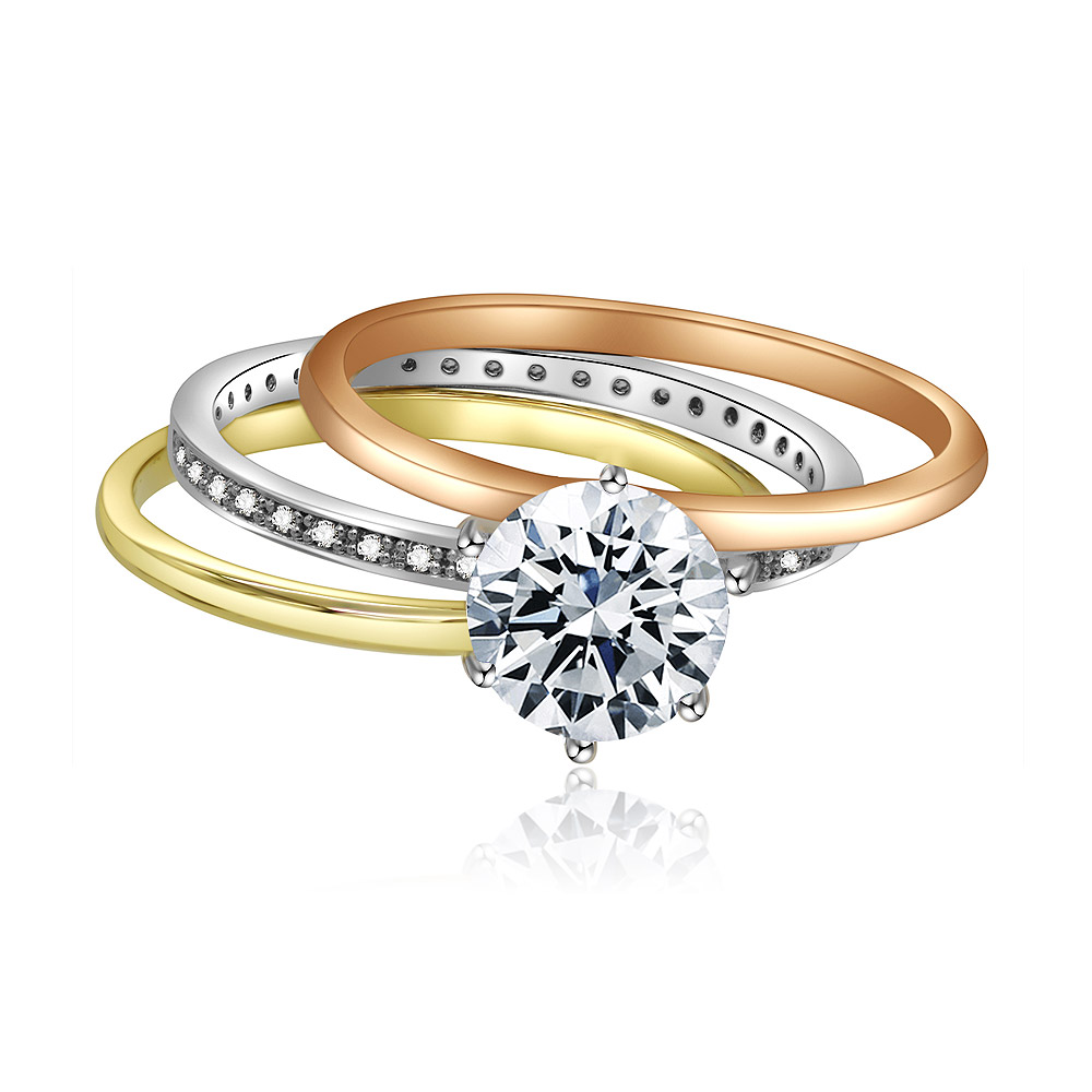 - The Three Tone CZ Solitaire Ring presented as part of an elegant engagement ring set with matching bands.