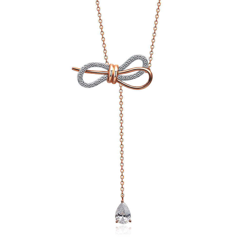 The Tied Ribbon Bow Dangle Necklace (Style: BNP02-RC-Z-00280) is a testament to our dedication to beautiful design and quality. The combination of rhodium and rose gold plating creates a sophisticated two-tone effect that complements the brilliance of the white cubic zirconia stones. This piece is part of our extensive Cubic Zirconia collection, designed for those who appreciate fine details and affordable luxury.