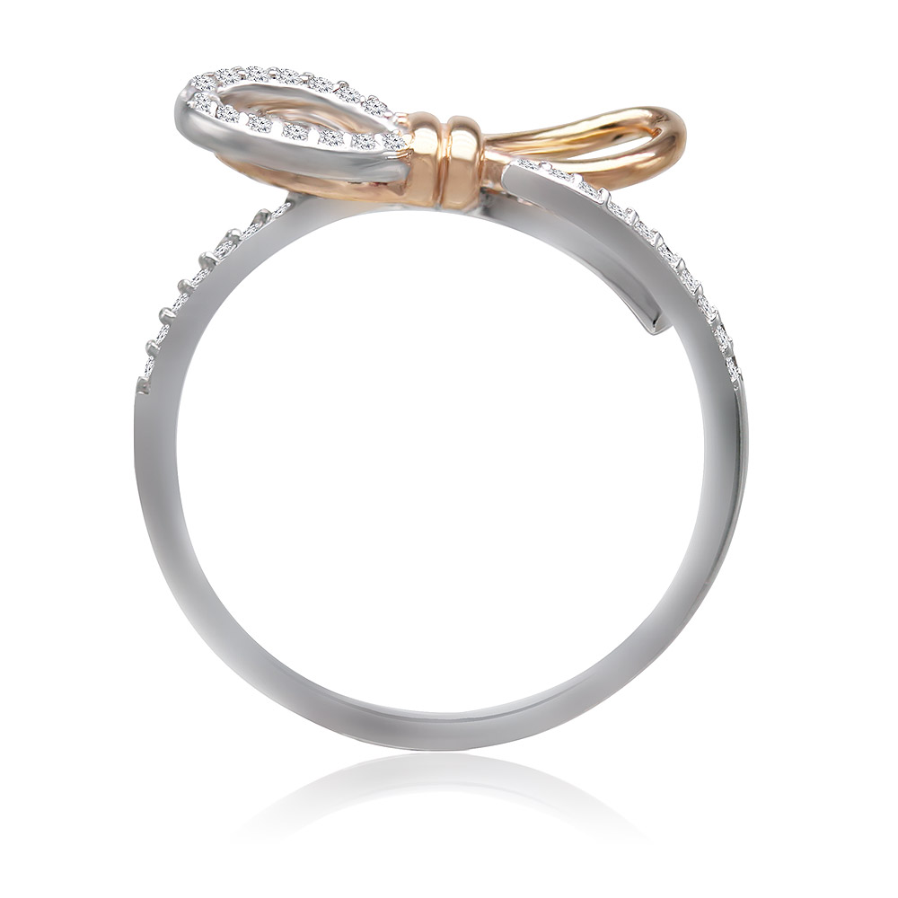 - Angled shot of the Tied Ribbon Bow Ring, displaying the small diamonds on the bow and the two-tone band.