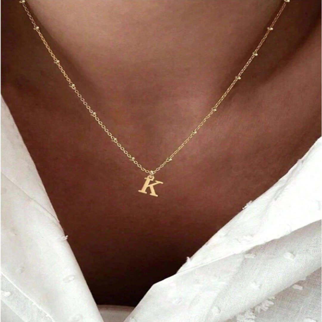 A close-up of the gold 'K' initial pendant on the stainless steel necklace.