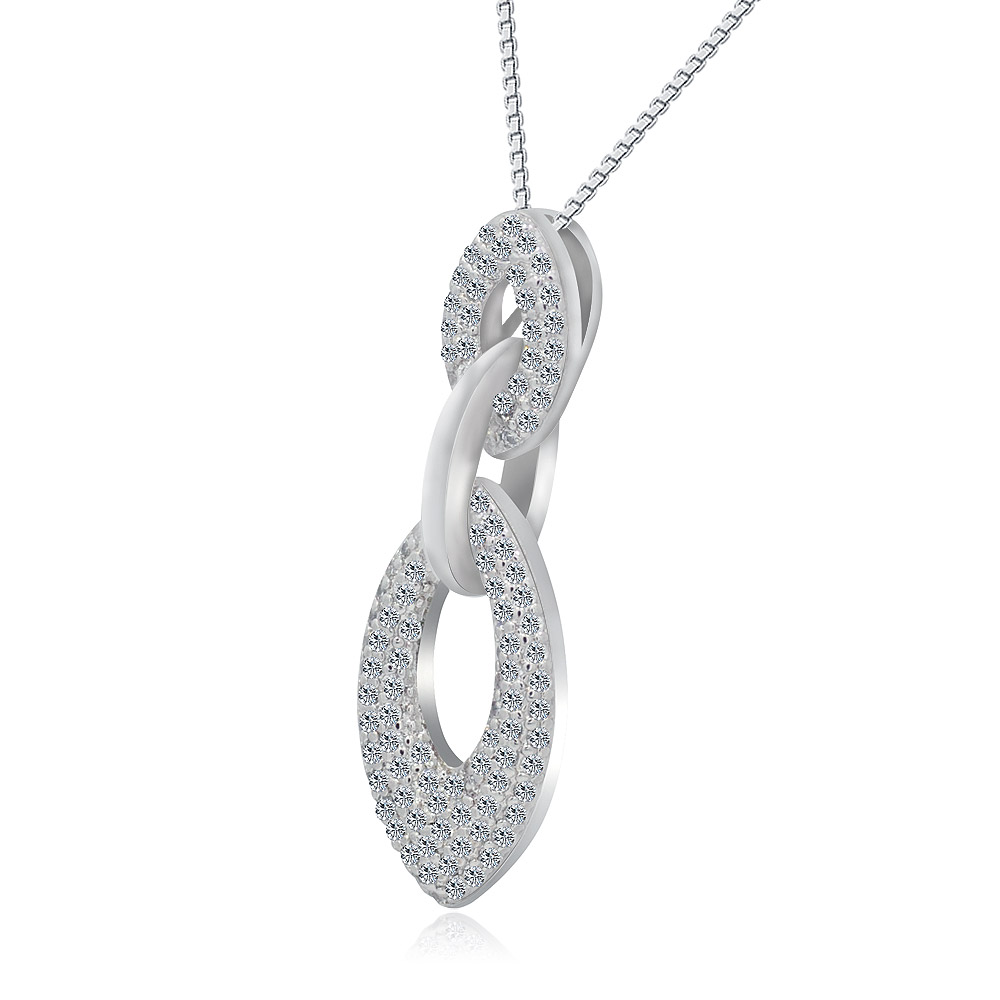 Close-up of the Tri Link Drop Pave CZ pendant, showing the double oval loop design with cubic zirconia encrustation.