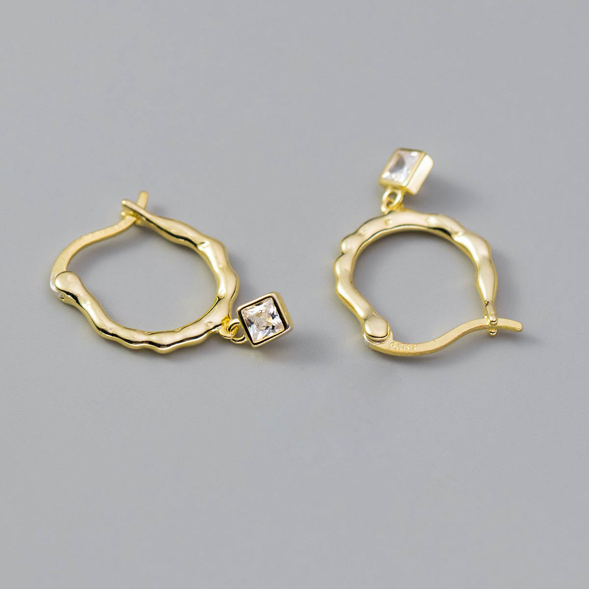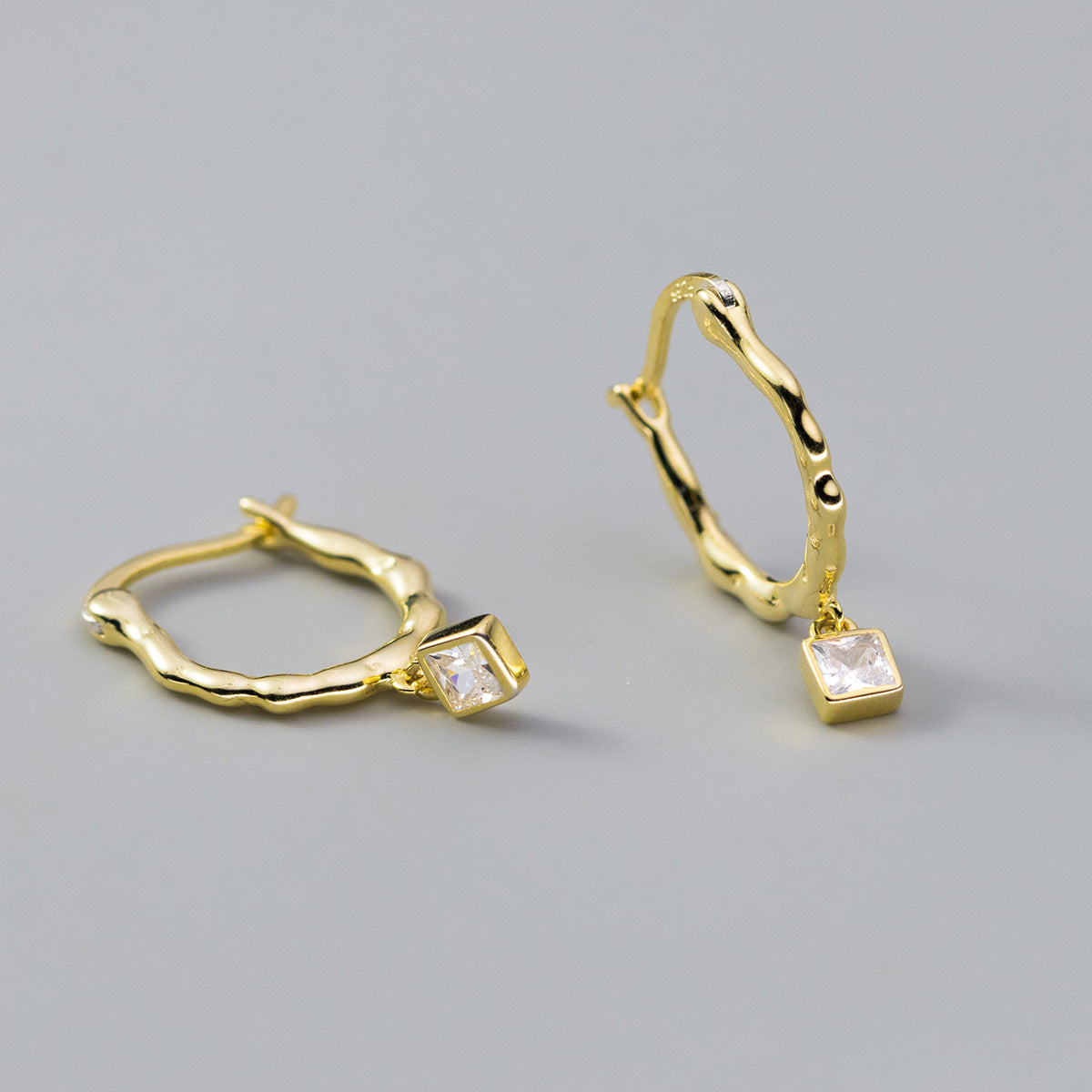 The gold wavy hoop earring with its sparkling square gemstone pendant.