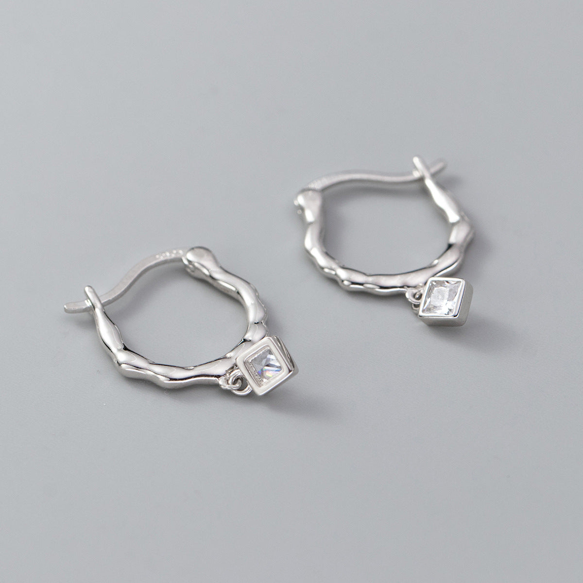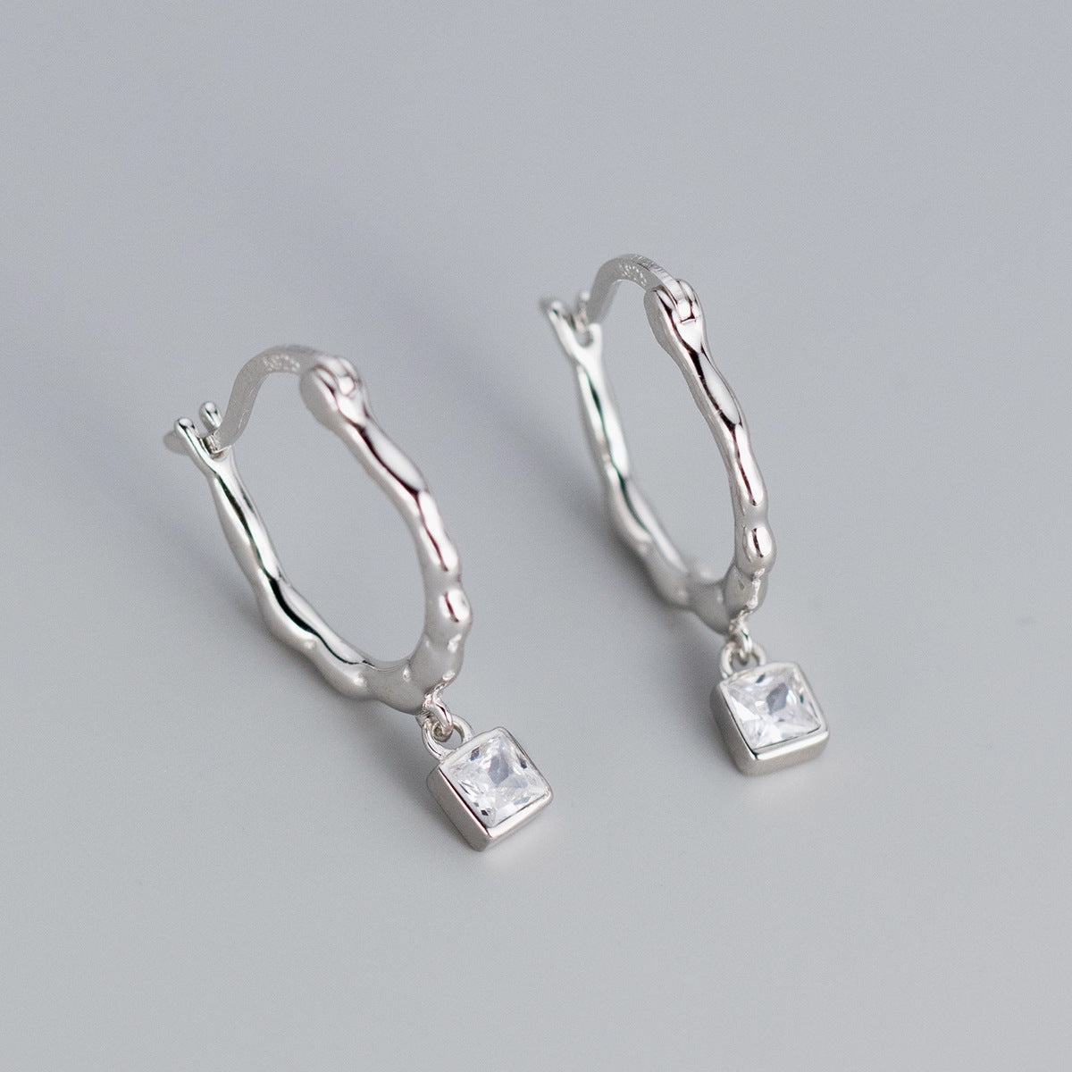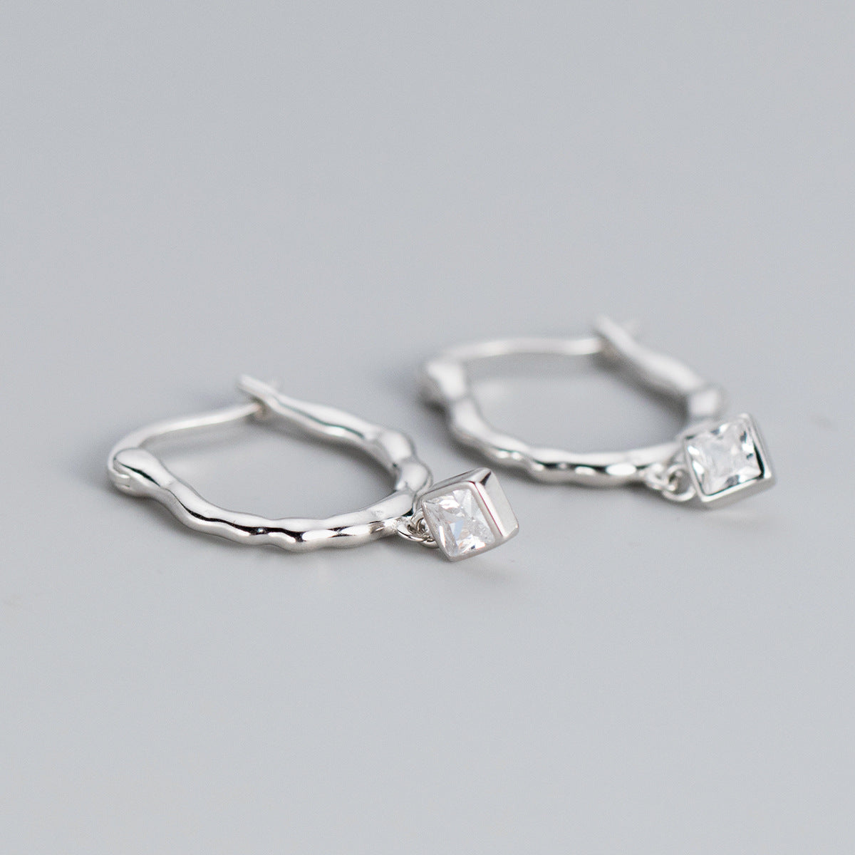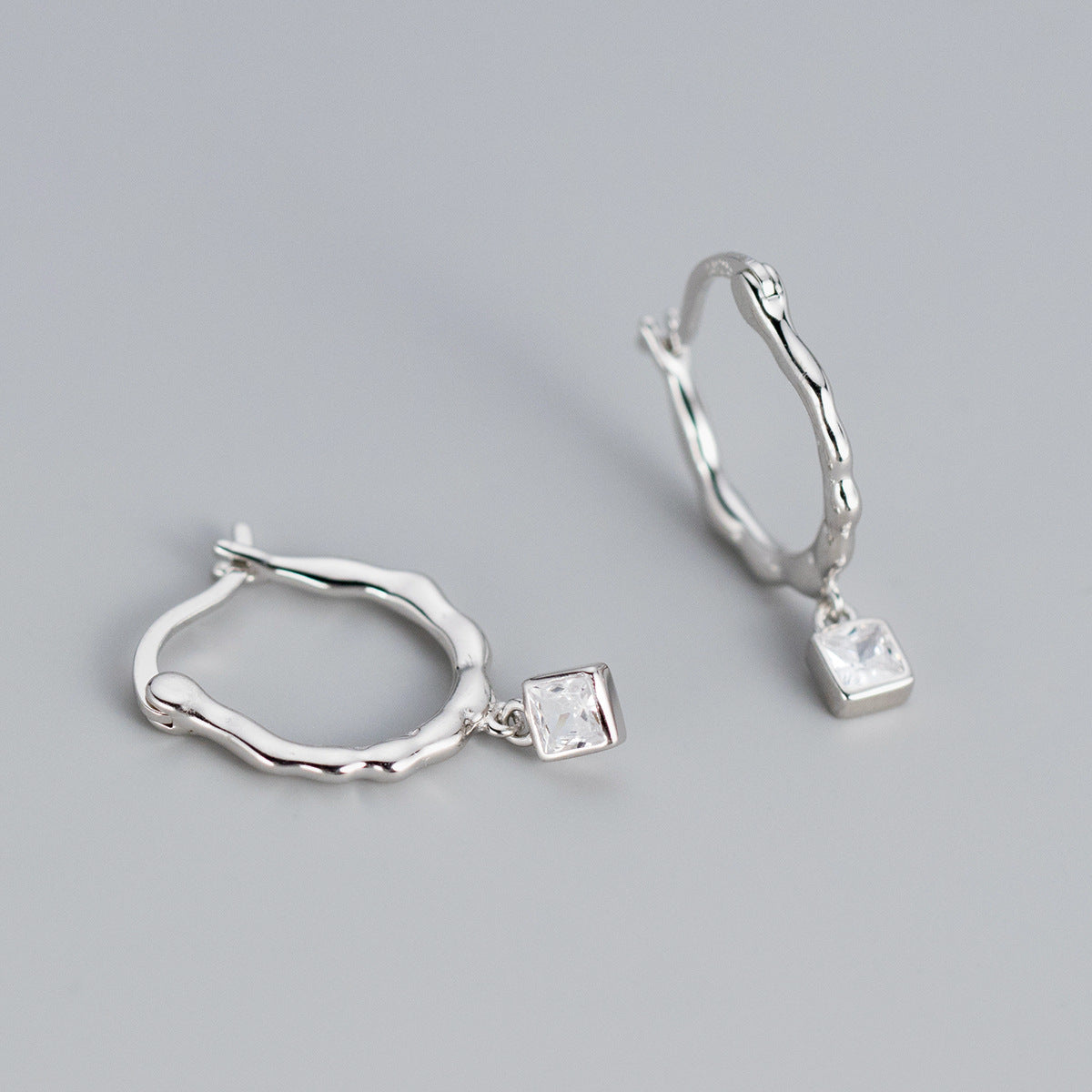 Promotional shot of the silver twisted earring with its square zircon charm.