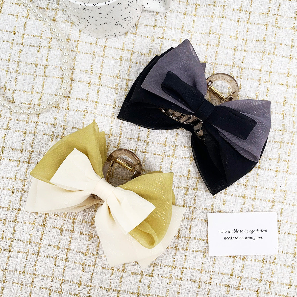 A lifestyle shot of the fabric bow hair clips with other fashion accessories.