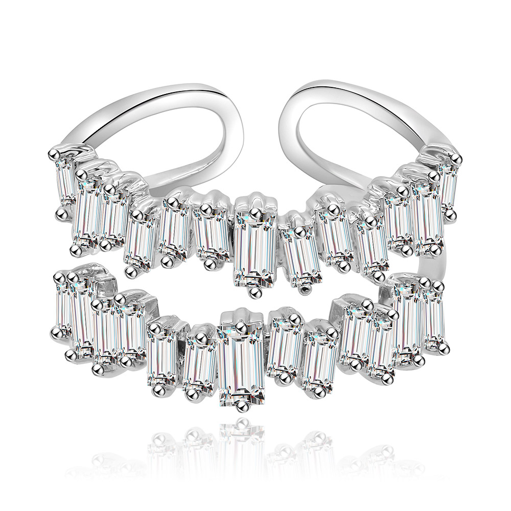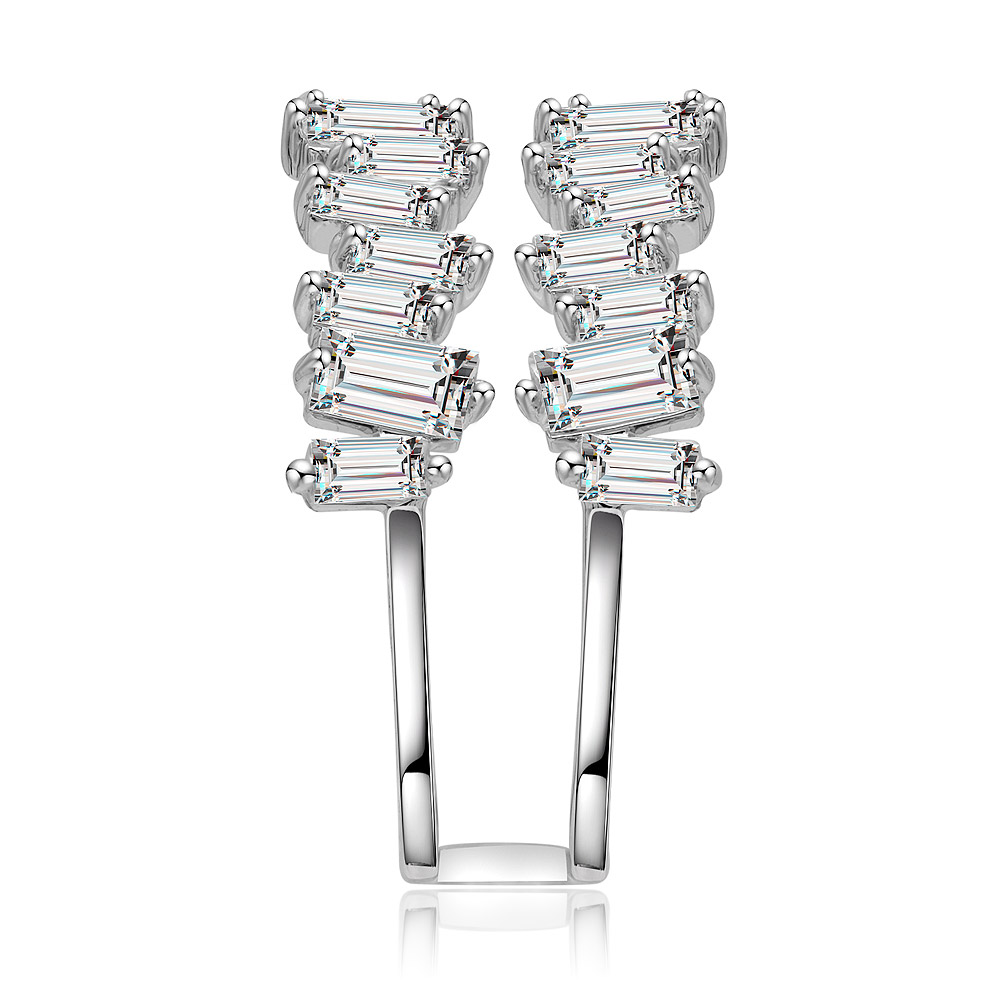 The Uneven Baguette Cut Morganite Ring is a testament to modern jewelry design, featuring a striking arrangement of prong-set, baguette-cut cubic zirconia stones on a unique two-bar structure. The base material is durable brass, enhanced with a premium rhodium plating that provides a brilliant, long-lasting shine and protects against tarnishing. Its semi-adjustable design ensures a comfortable and secure fit for various finger sizes, making it a versatile addition to any jewelry collection.