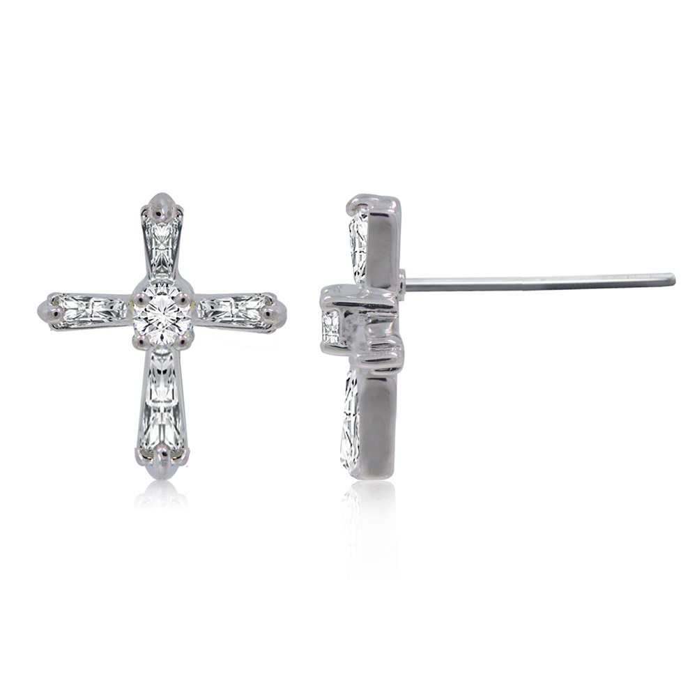 Each earring is adorned with brilliant white cubic zirconia stones, meticulously set to form a classic cross shape. The result is a stunning piece of jewelry that is both meaningful and stylish. Whether for personal wear or as a thoughtful gift, these earrings are a perfect choice.