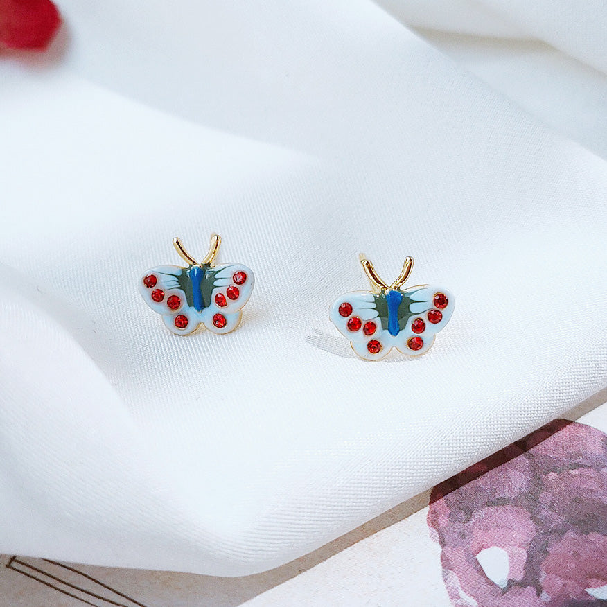 Detailed product shot of the butterfly earrings with blue bodies and red-dotted wings.