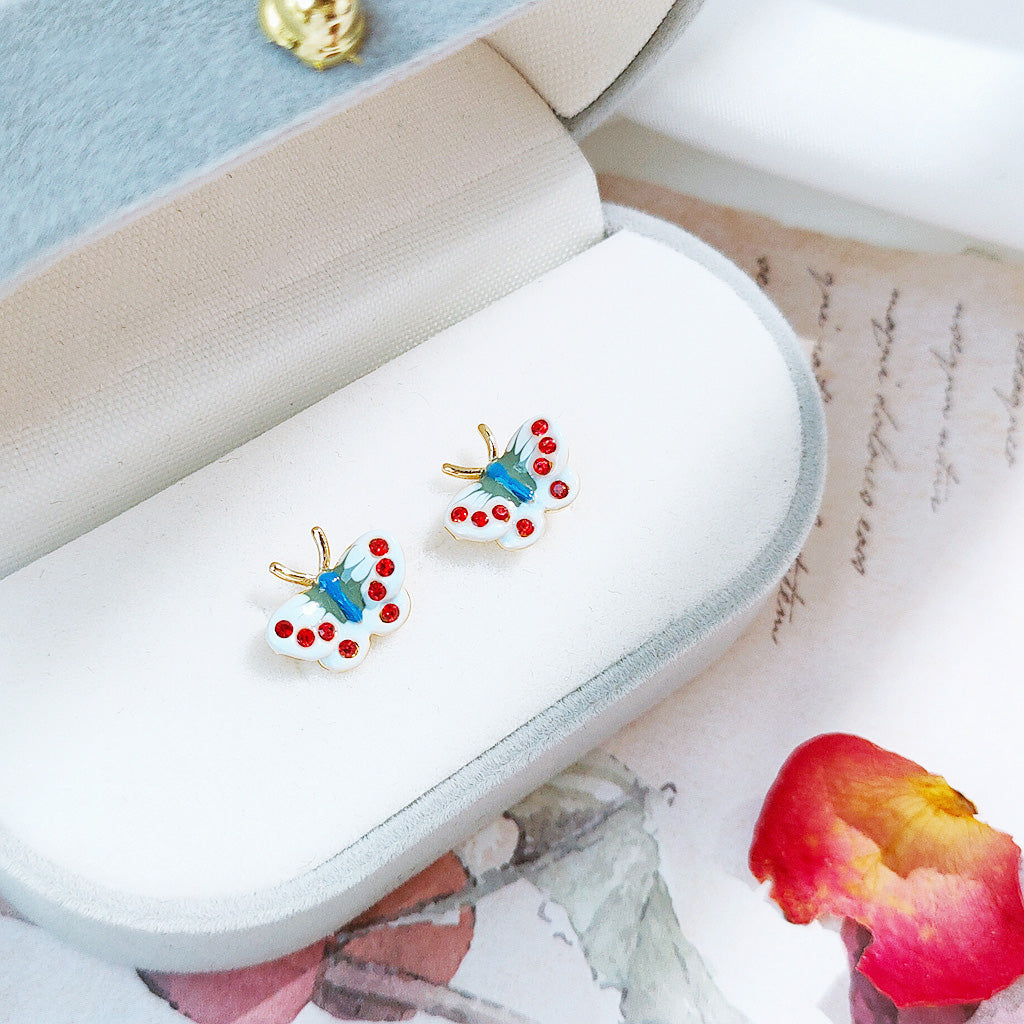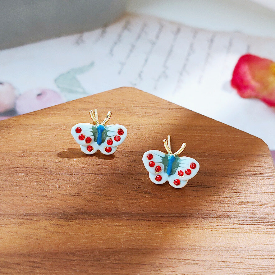 A pair of butterfly earrings with red dot details on the wings.