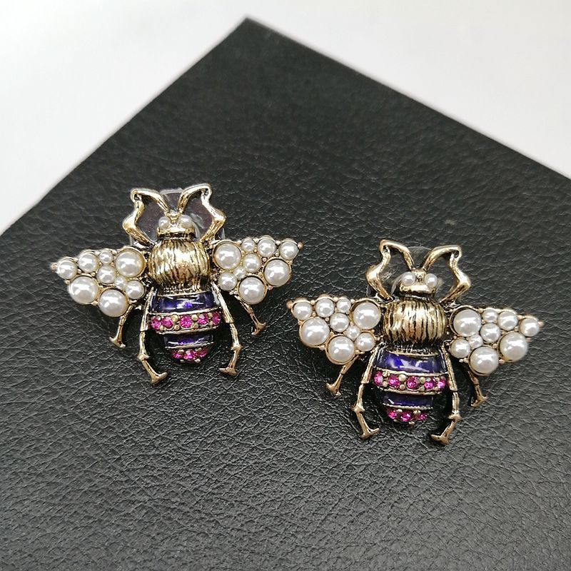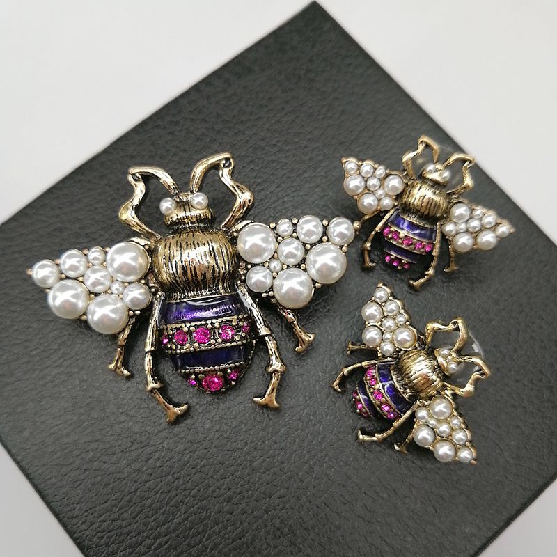 The bee brooch displayed alongside matching earrings, illustrating a complete, elegant jewelry set.