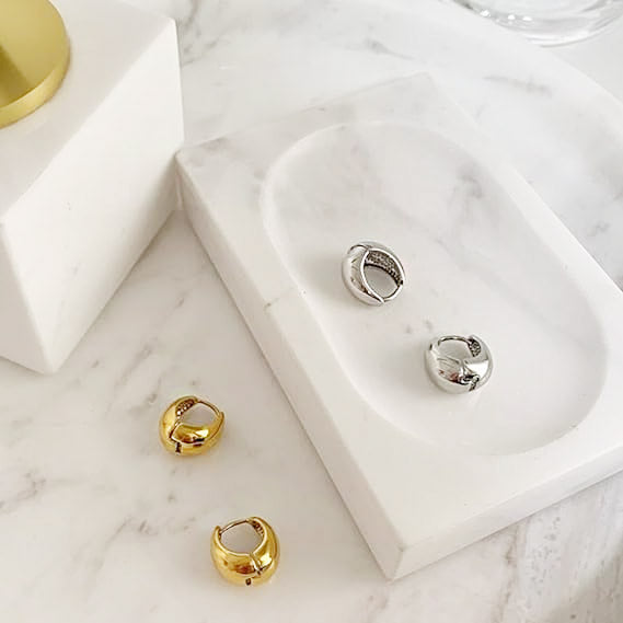 Lifestyle display of both gold and silver teardrop earrings on a marble surface.