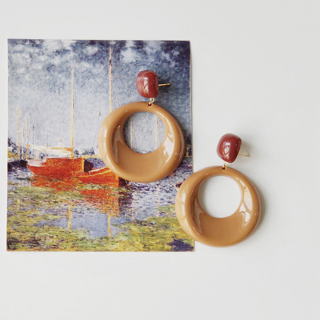 Detailed view of a pair of brown glossy earrings featuring a circular top and a dark red square stone accent.