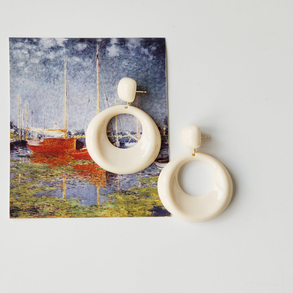 A pair of minimalist white circular earrings with a simple gold post, displayed on a white surface.