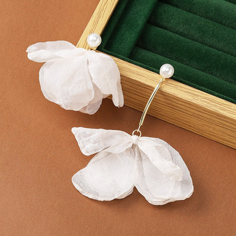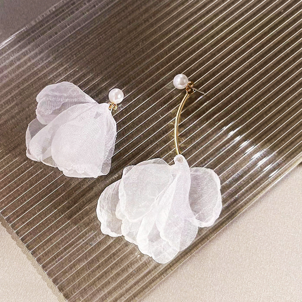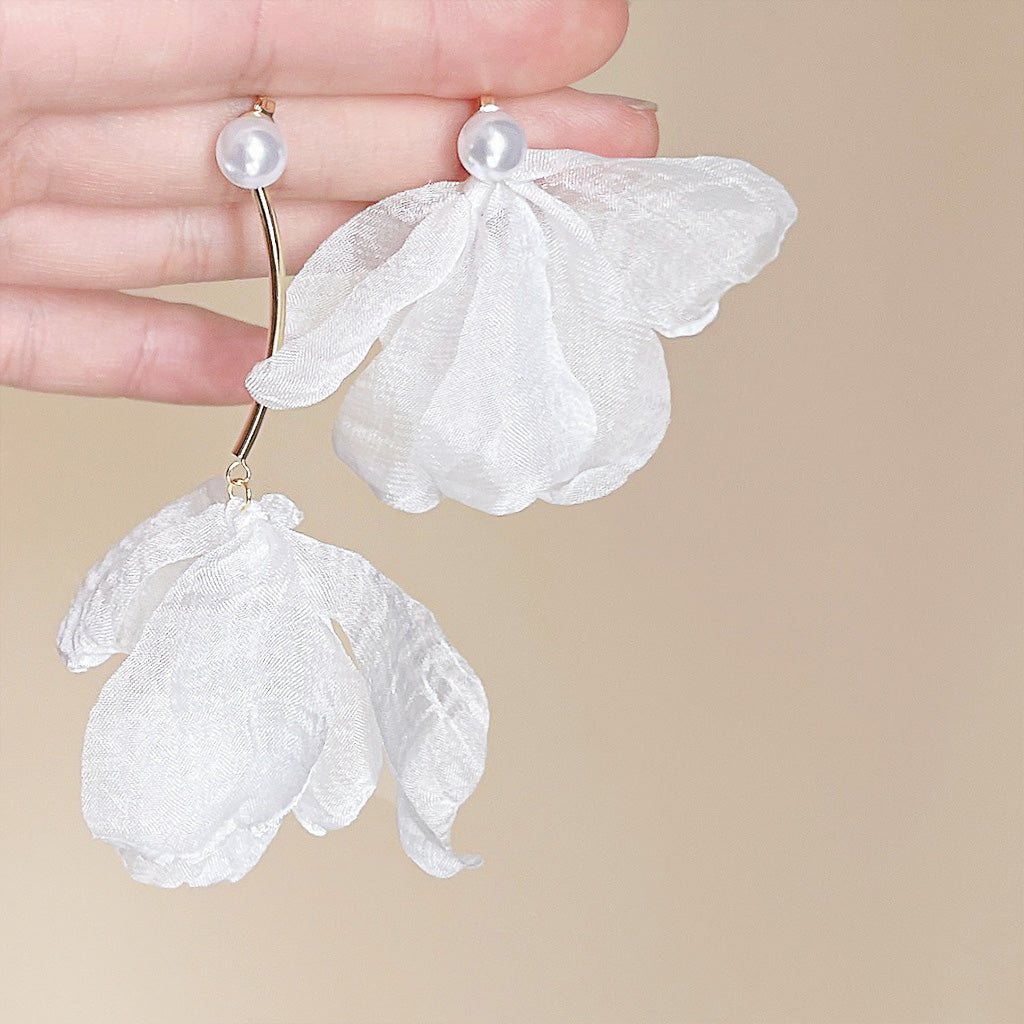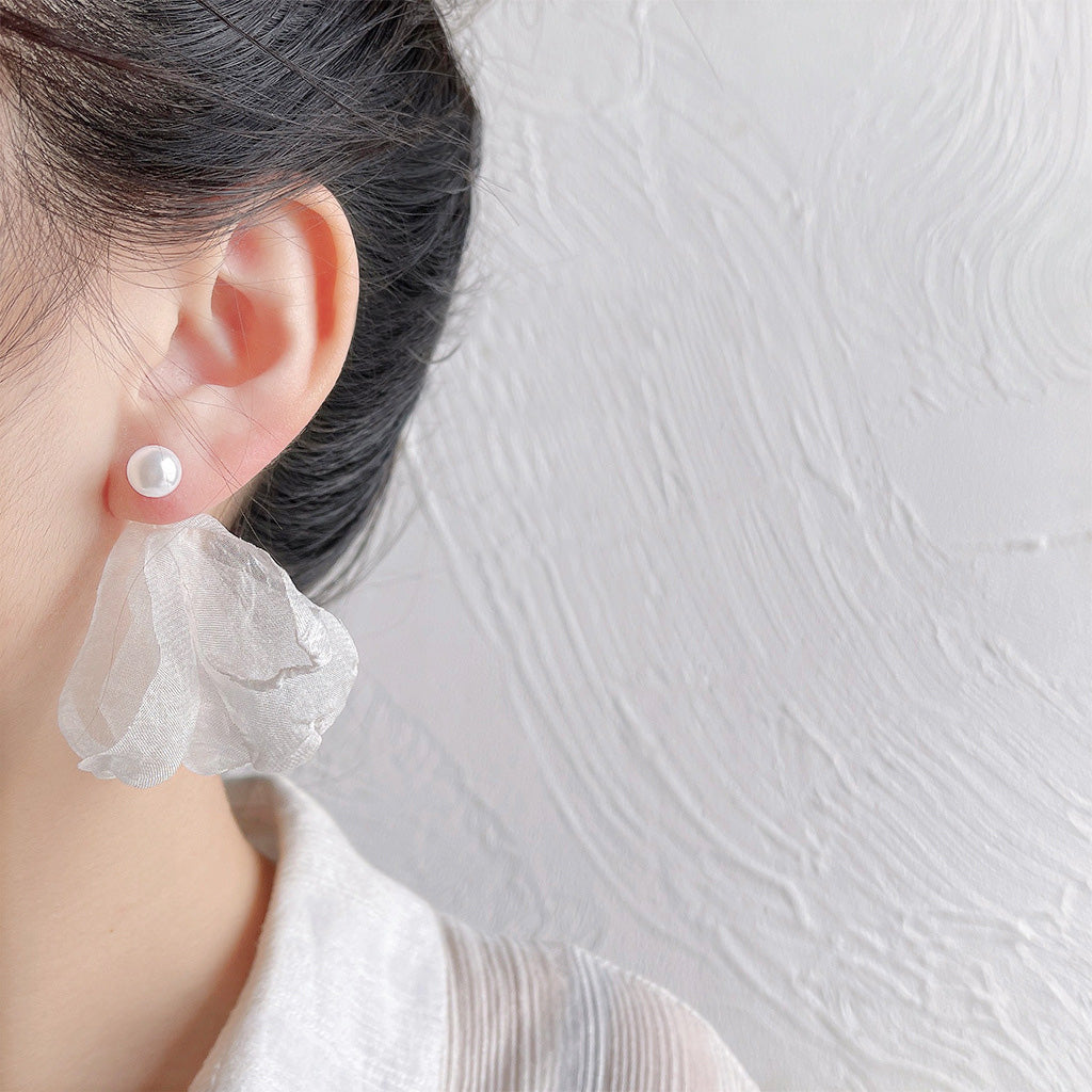 A product photo showing the intricate fabric-like texture of the white flower earrings with pearl studs.
