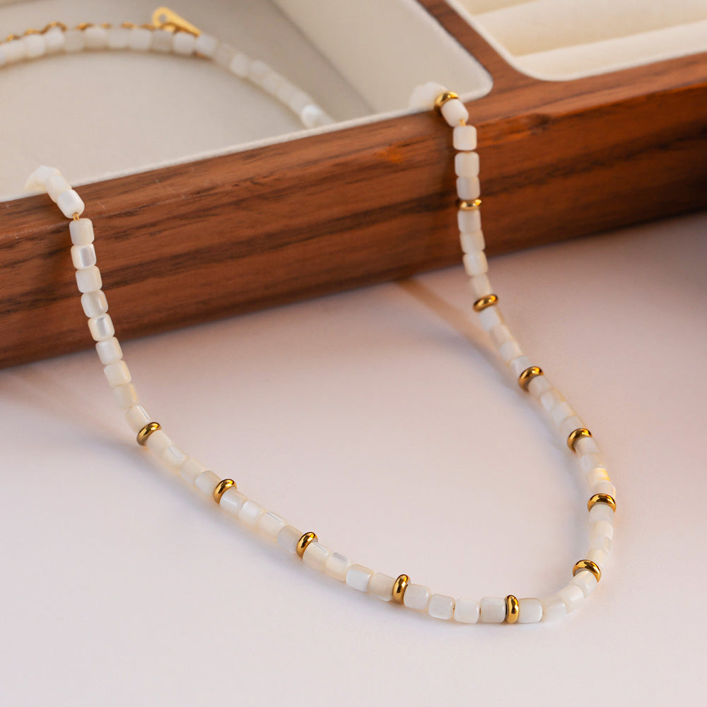 This exquisite necklace set is crafted for style-conscious individuals and businesses looking for high-quality fashion jewelry. The combination of waterproof stainless steel and natural white shell beads creates a piece that is both beautiful and built to last. The gold-tone plating provides a luxurious finish that complements any skin tone.