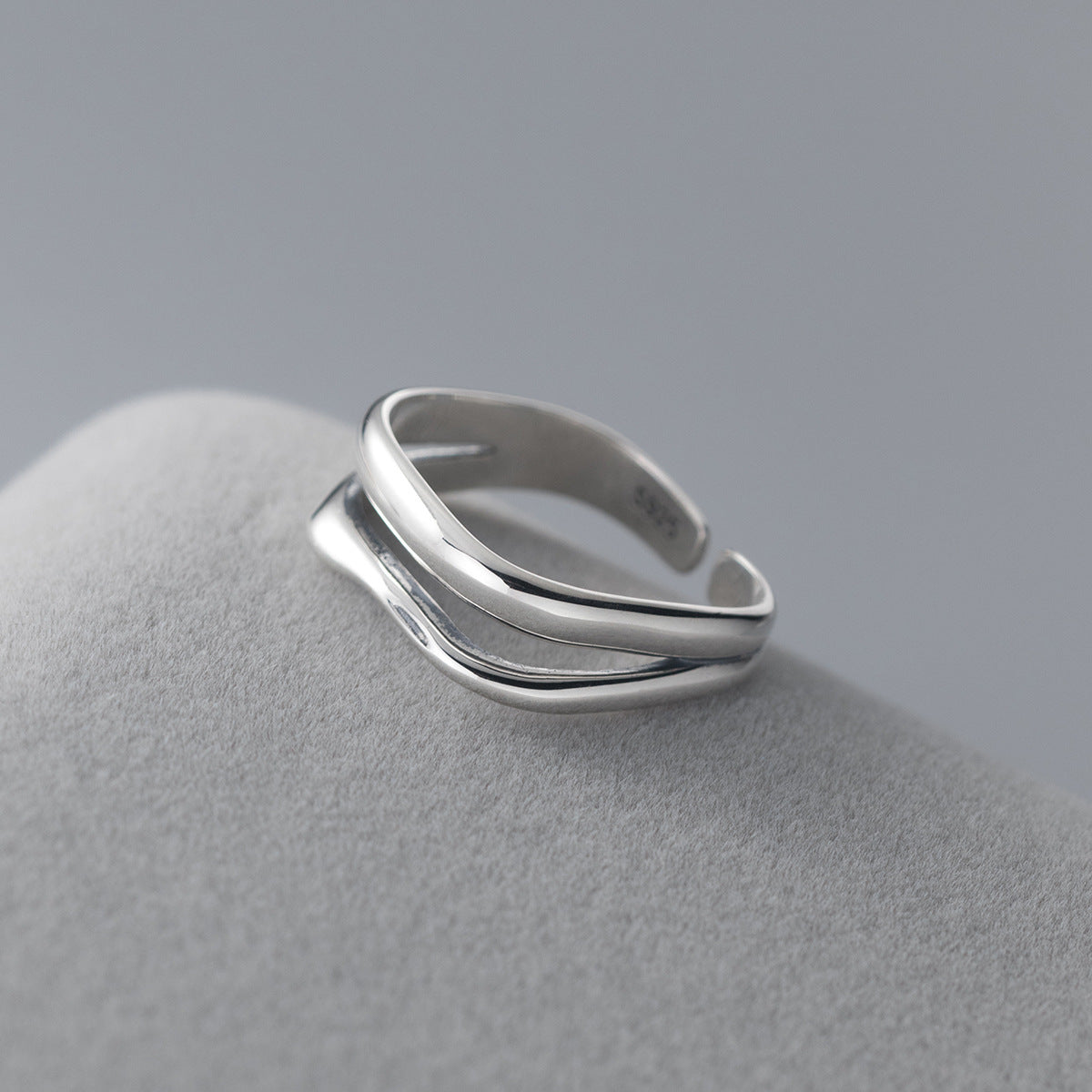 Detailed view of the 925 sterling silver wave ring's fluid, double-layered design.