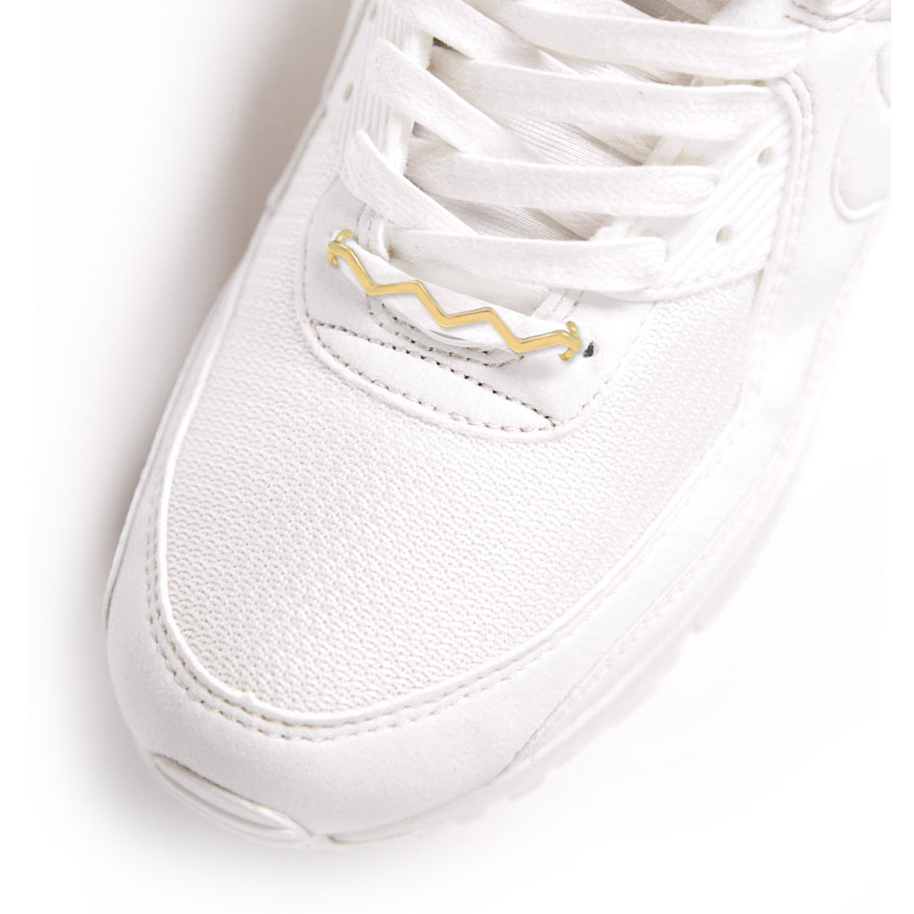 Close-up view of the metal wave shoelace charm, highlighting its gold plating and unique zigzag shape with loops for laces.