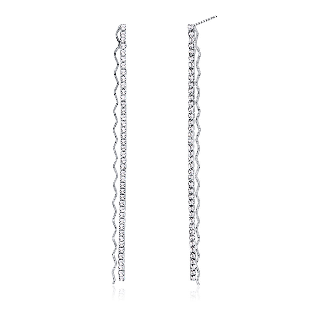 Side profile of the wavy silver earrings, showing the dual strands of sparkling rhinestones.