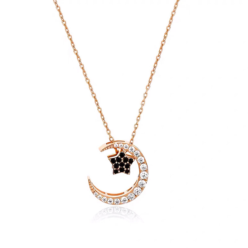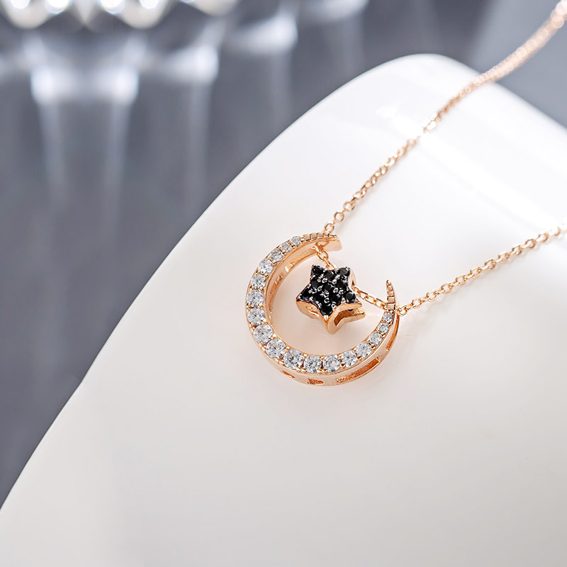 Rose gold version of the necklace, featuring a crescent moon and star pendant with clear and black stones.