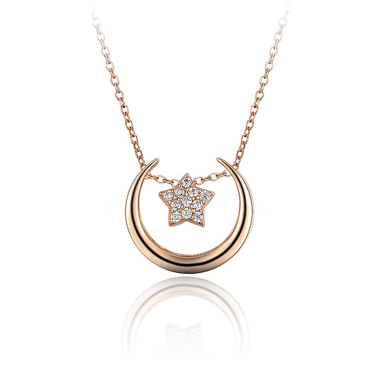 Elegant rose gold necklace with a delicate crescent moon and star pendant.