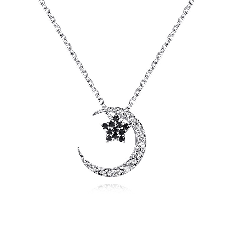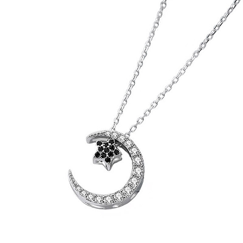 Close-up of the silver crescent moon and star pendant with white and black cubic zirconia.