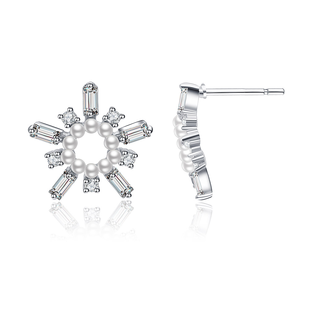 A pair of White As Snow Pearl Earrings displayed to show their snowflake shape and rhodium-plated finish.