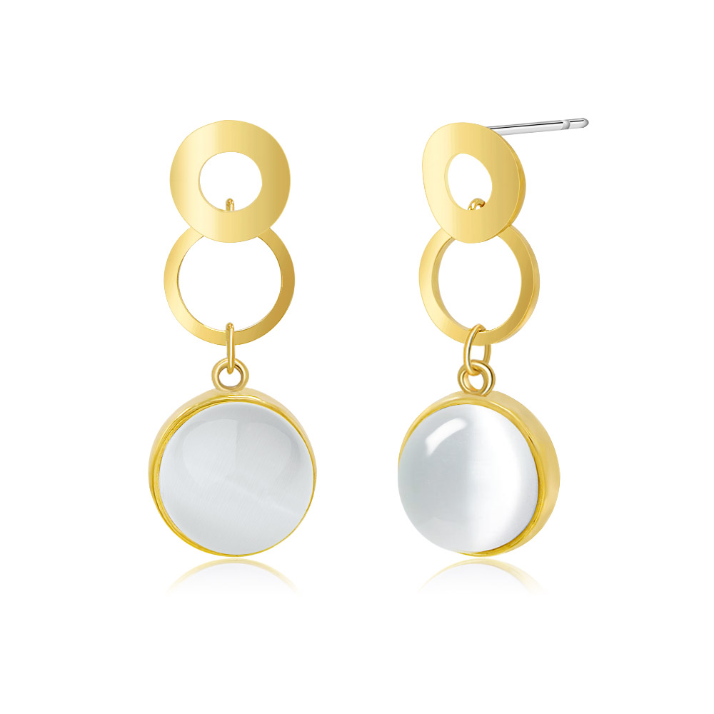 Alternate view of the gold-plated White Cat's Eye Dangling Earrings, showcasing their elegant drop design.