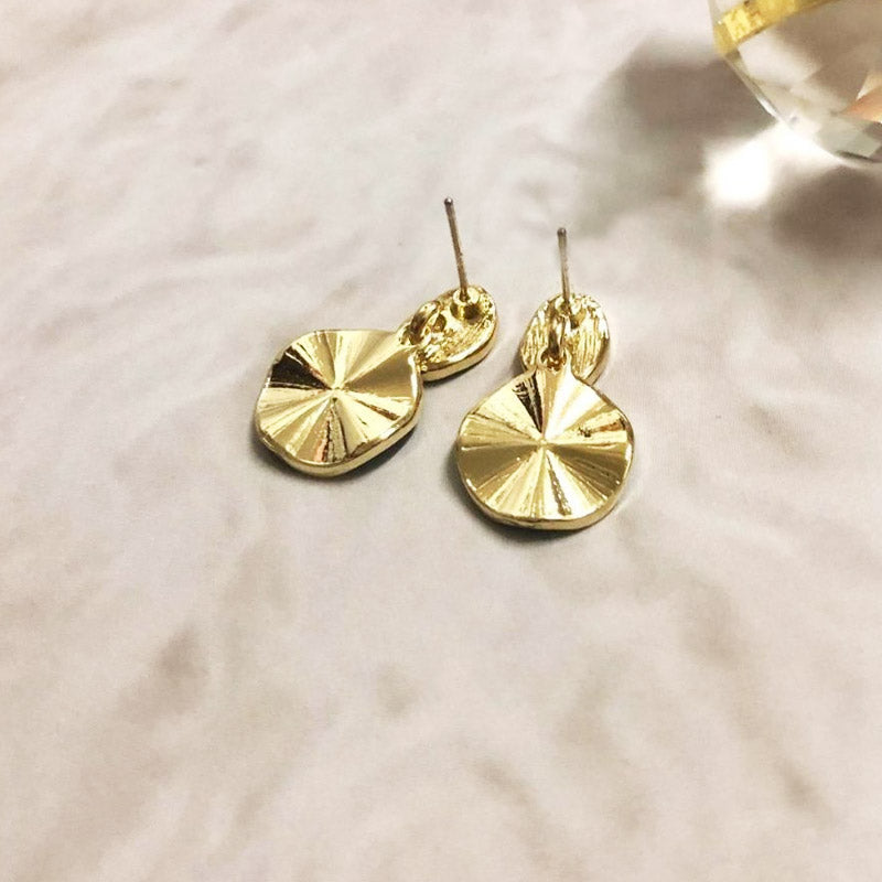 Close-up view of the textured sunburst pattern on the gold-plated brass component of the earrings.