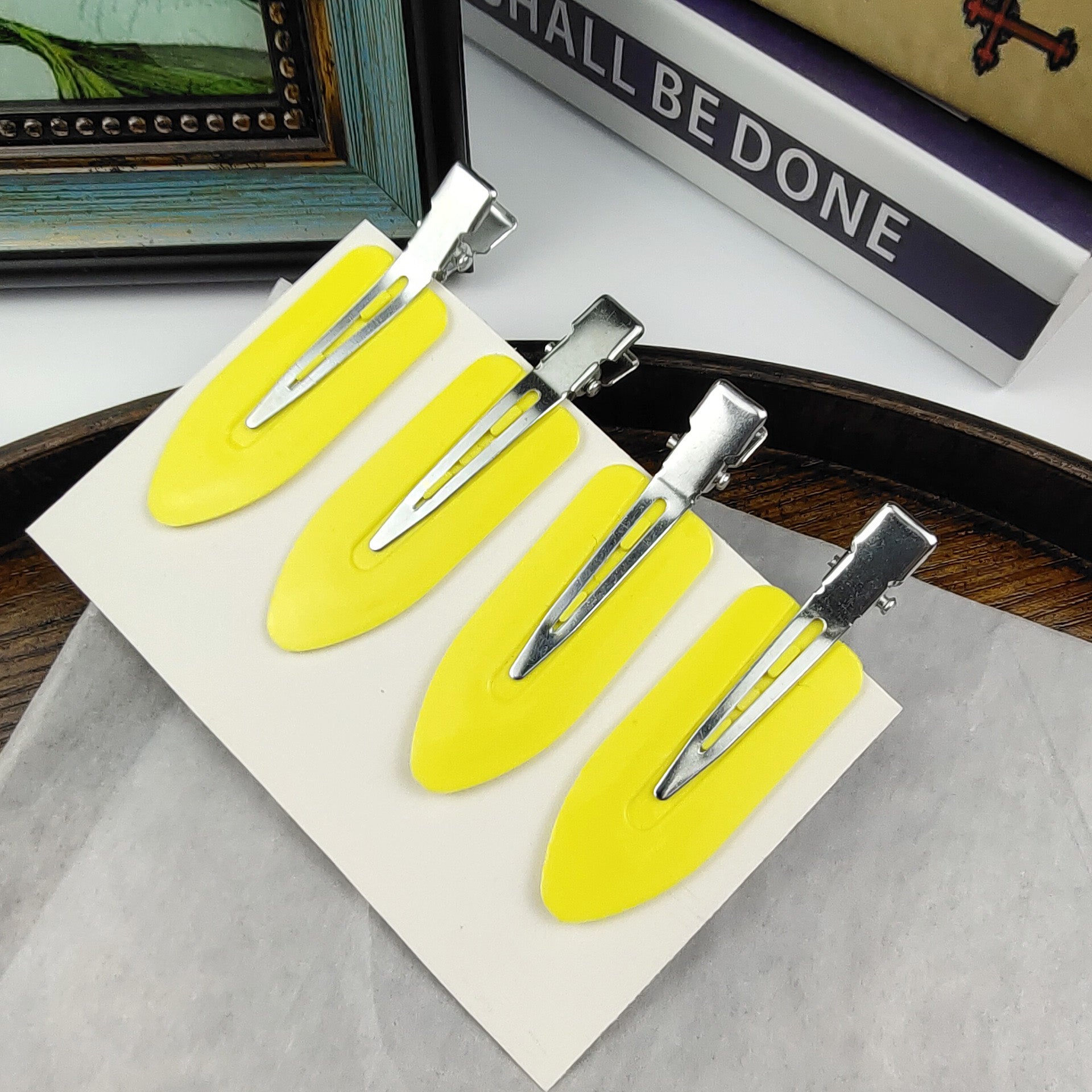 - Close-up of a set of four yellow creaseless hair clips with silver clasps.
