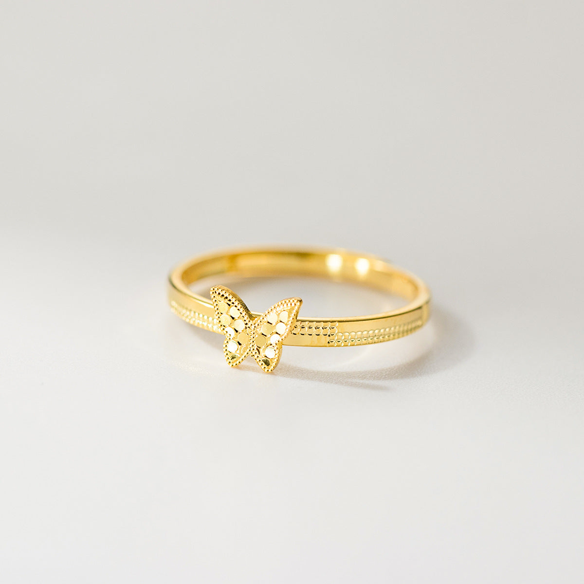 Close-up of the gold-plated 925 sterling silver butterfly ring, highlighting its delicate iced texture and minimalist design.