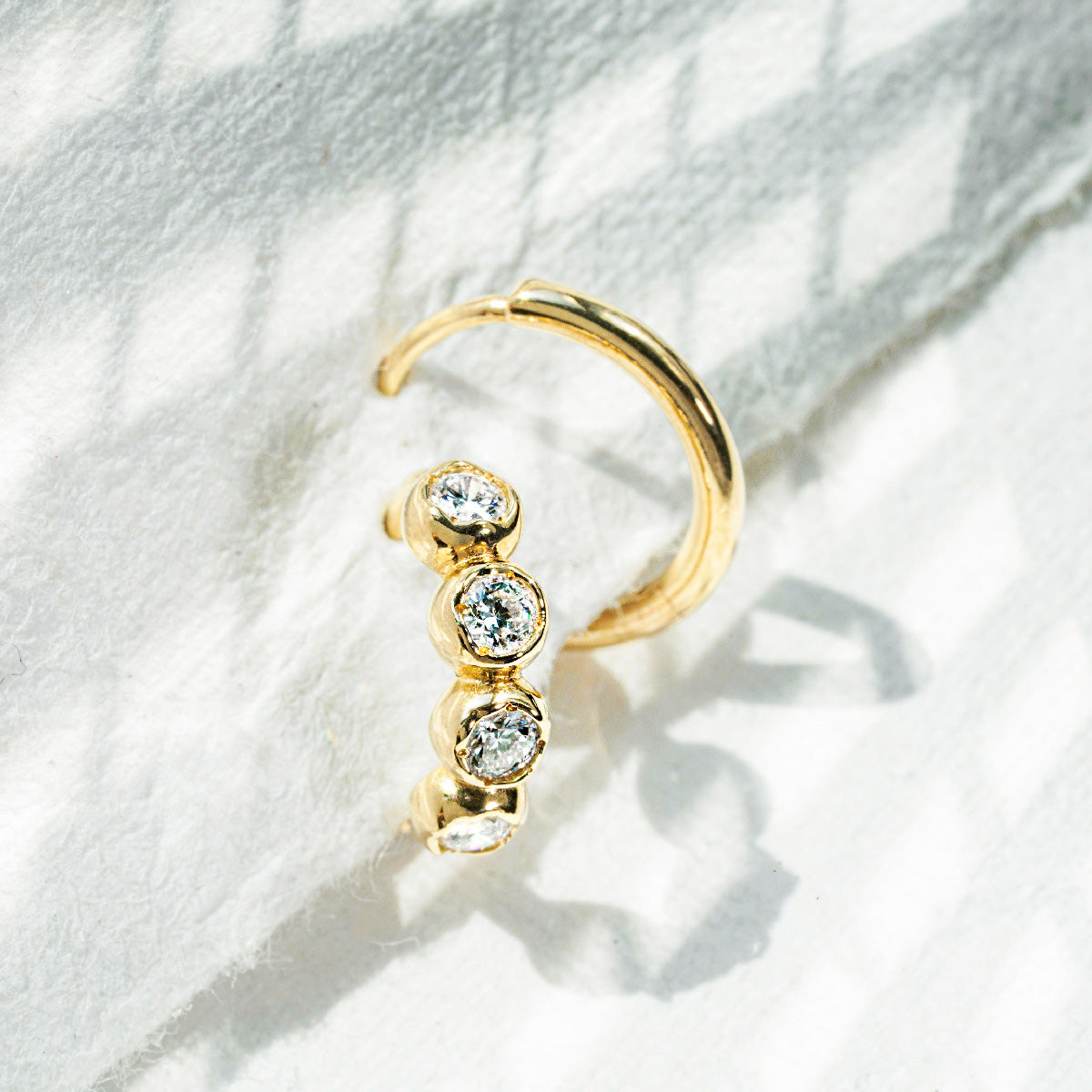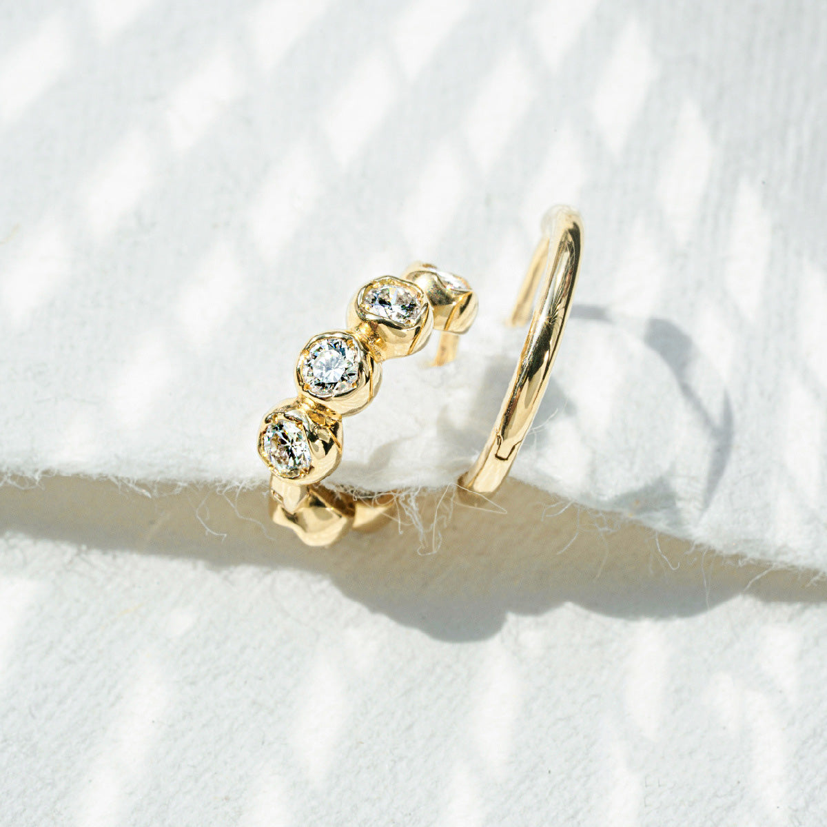 Detailed view of a single bezel-set CZ hoop earring highlighting the craftsmanship.