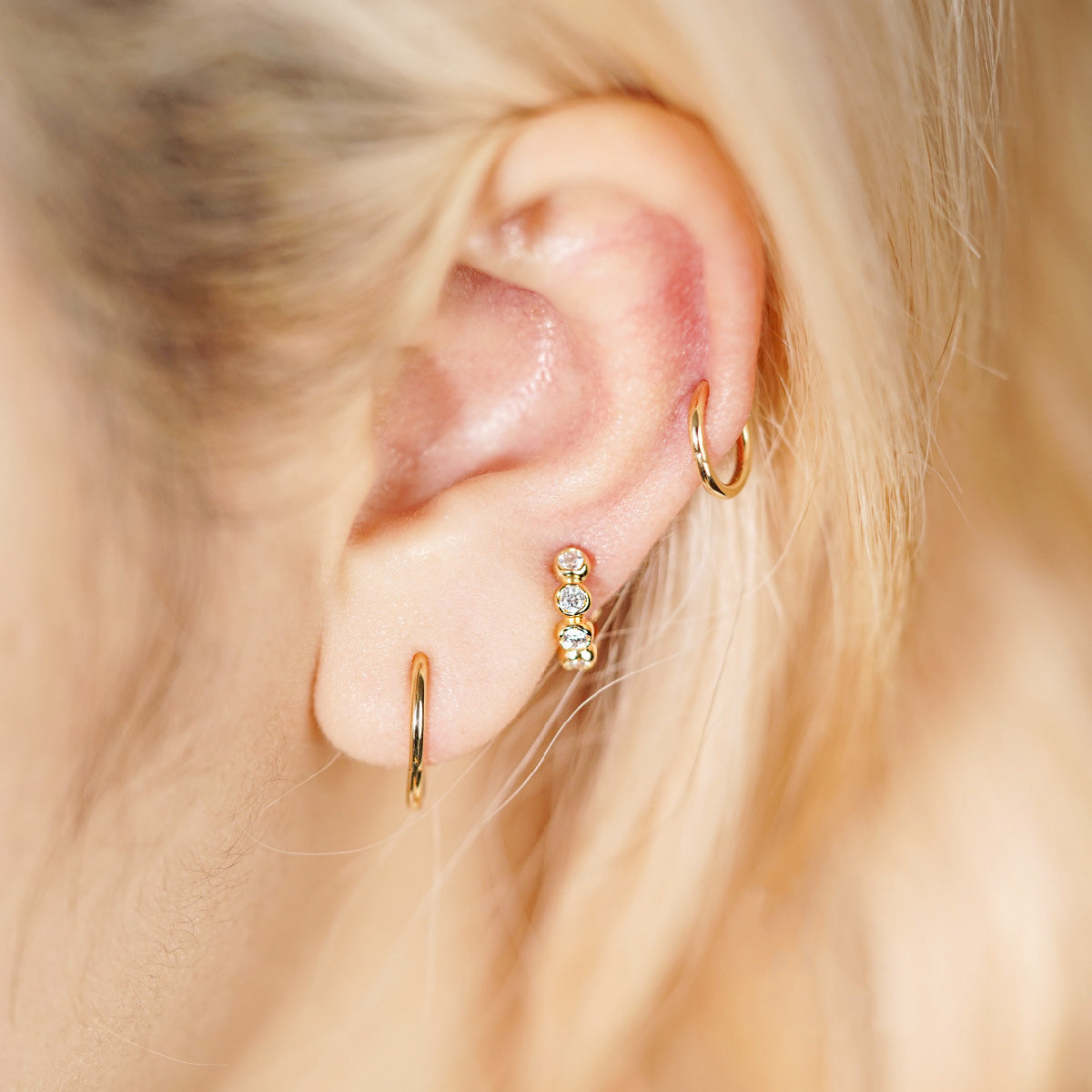 Lifestyle image showing how the sterling silver hoop earrings can be styled with other piercings.