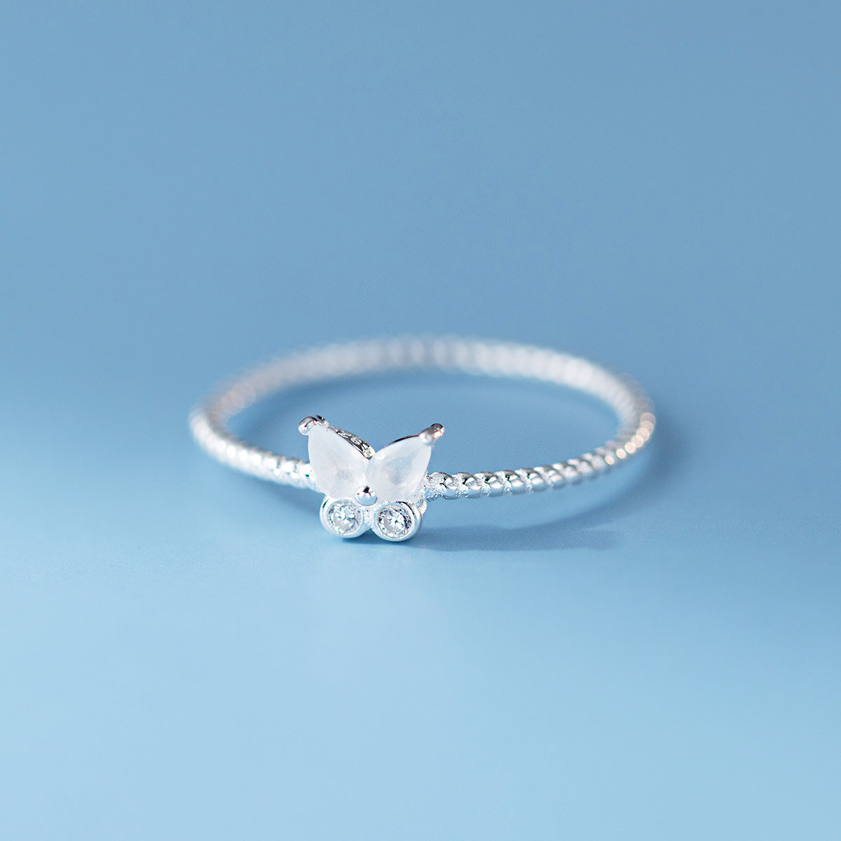 Close-up of two sterling silver butterfly rings with white and blue gemstones.