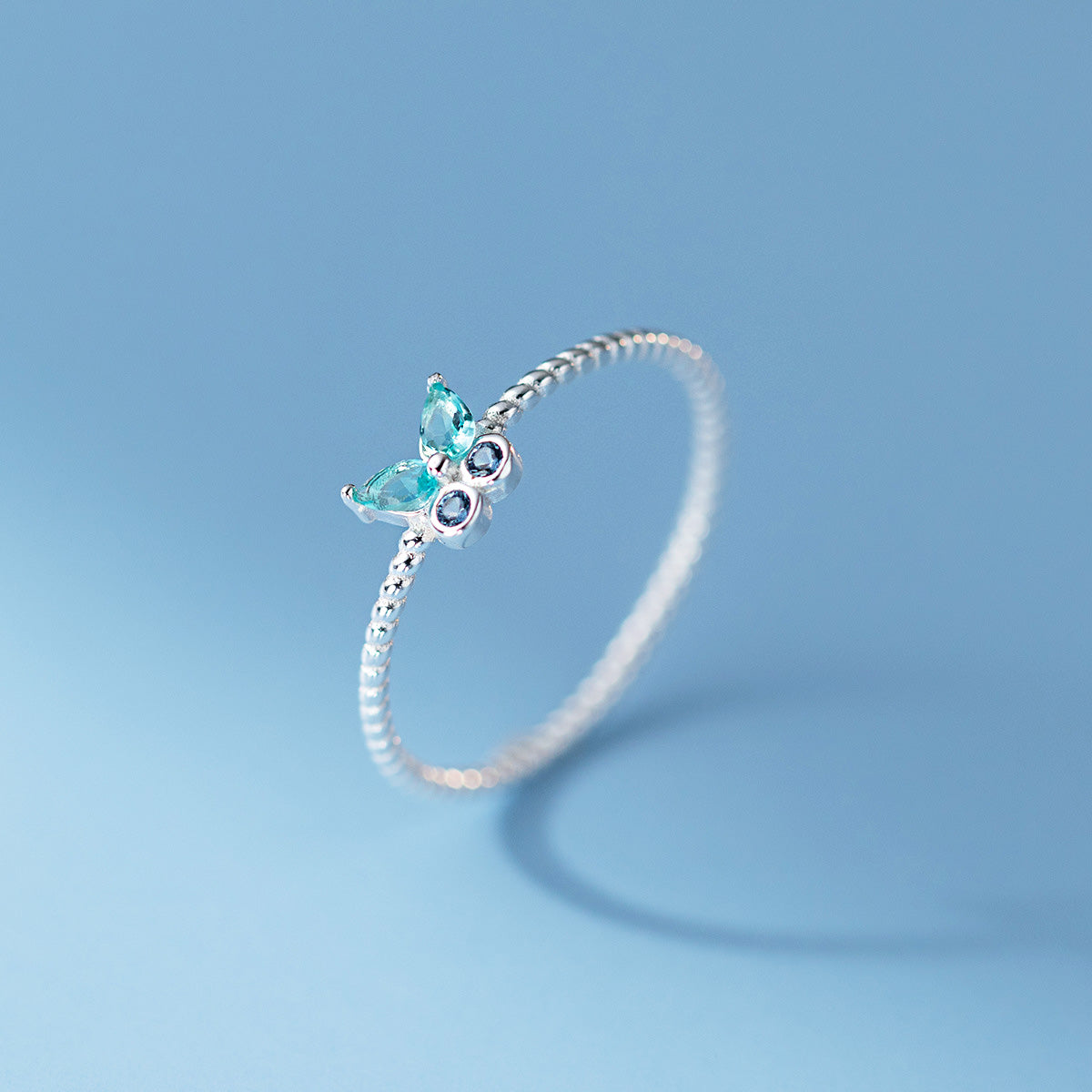 Detailed view of the 925 silver butterfly ring with vibrant blue gemstones.