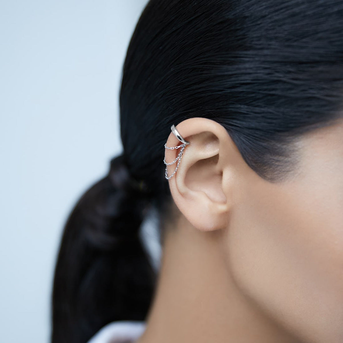 The 925 sterling silver ear cuff with layered chains, showing its elegant and trendy design.