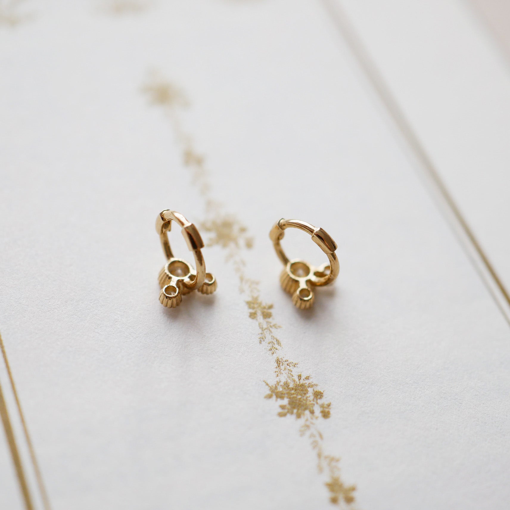 - The huggie hoop earrings presented on a wooden box, emphasizing the quality materials and sparkling gemstones.