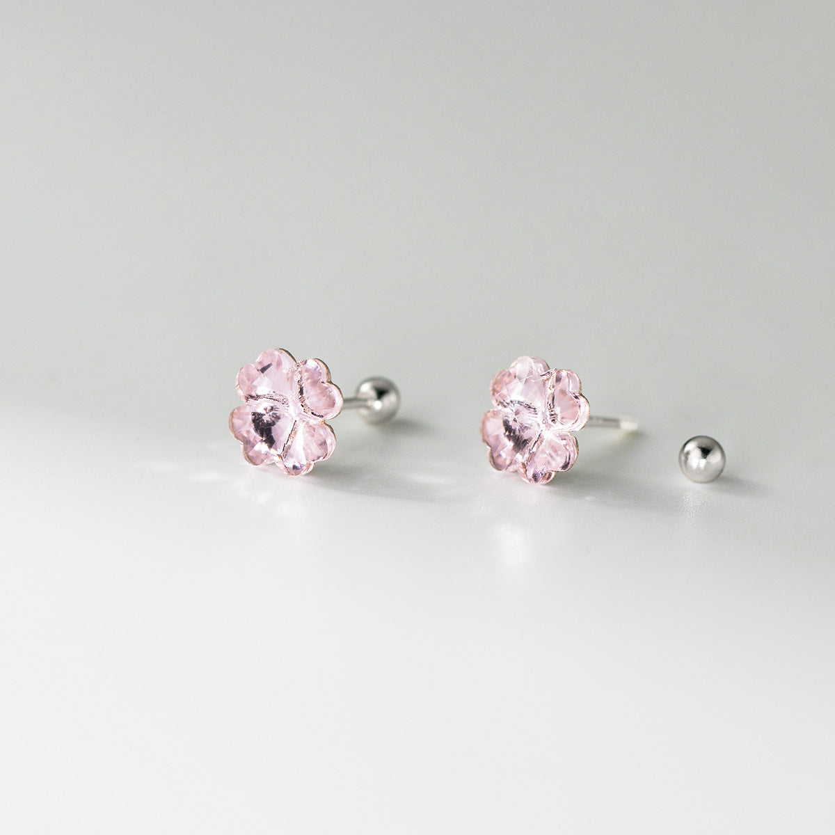 - A pair of delicate pink crystal four-leaf clover stud earrings in 925 sterling silver.