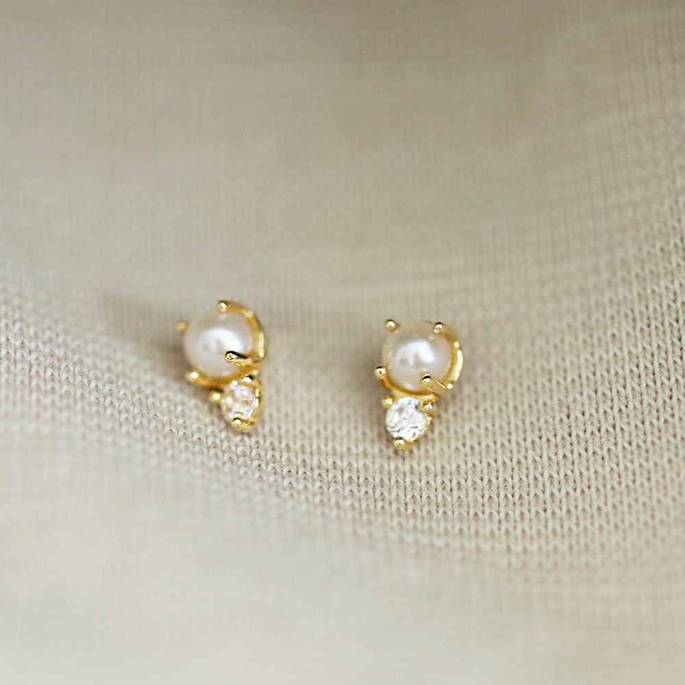 Model wearing the 925 sterling silver mini cubic zirconia and pearl stud earrings to show scale and style.