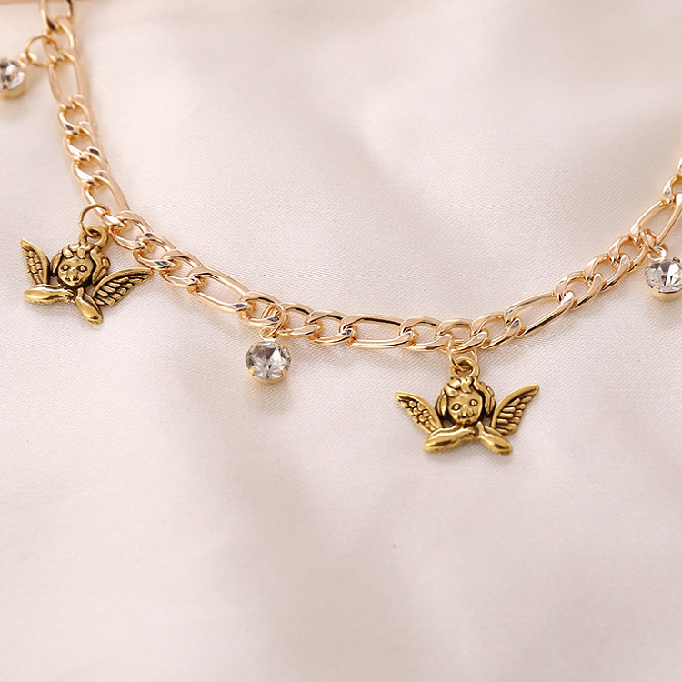 Another angle of the gold angel charm necklace, highlighting the intricate details and gemstones.