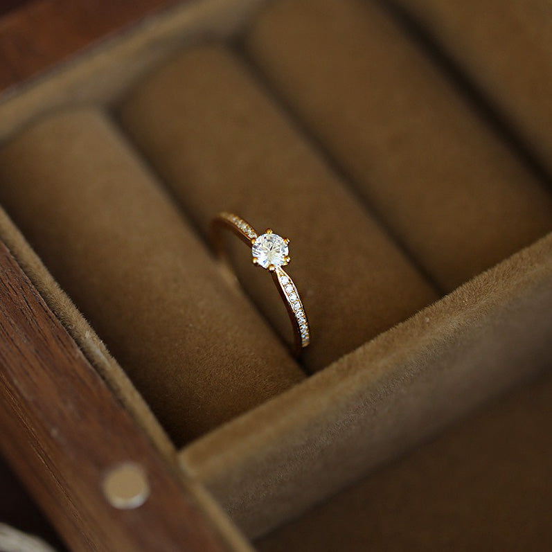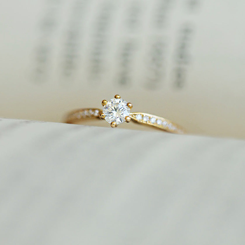 Detailed product shot of the six-prong solitaire ring, showcasing the brilliant center stone and polished band.